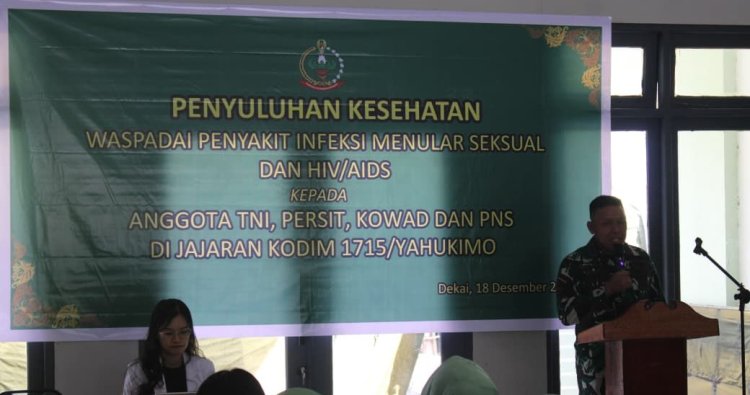 Yahukimo - Kodim 1715/Yahukimo menggelar kegiatan sosialisasi dan penyuluhan bahaya HIV/AIDS serta Infeksi Menular Seksual (IMS) sebagai upaya pencegahan penyebaran penyakit di lingkungan prajurit dan keluarga. Kegiatan ini berlangsung di Aula Lobby Makodim 1715/Yahukimo Desa Dekai, Distrik Dekai, Kabupaten Yahukimo, Kamis (18/12/2025). Kegiatan tersebut dihadiri langsung oleh Komandan Kodim 1715/Yahukimo Letkol Inf Didiet Trilaksono, S.M., M.H.I. didampingi Ketua Persit Kartika Chandra Kirana Cabang XIV Kodim 1715/YHK, Ny. Indah Didiet Trilaksono serta diikuti oleh prajurit dan anggota Persit.